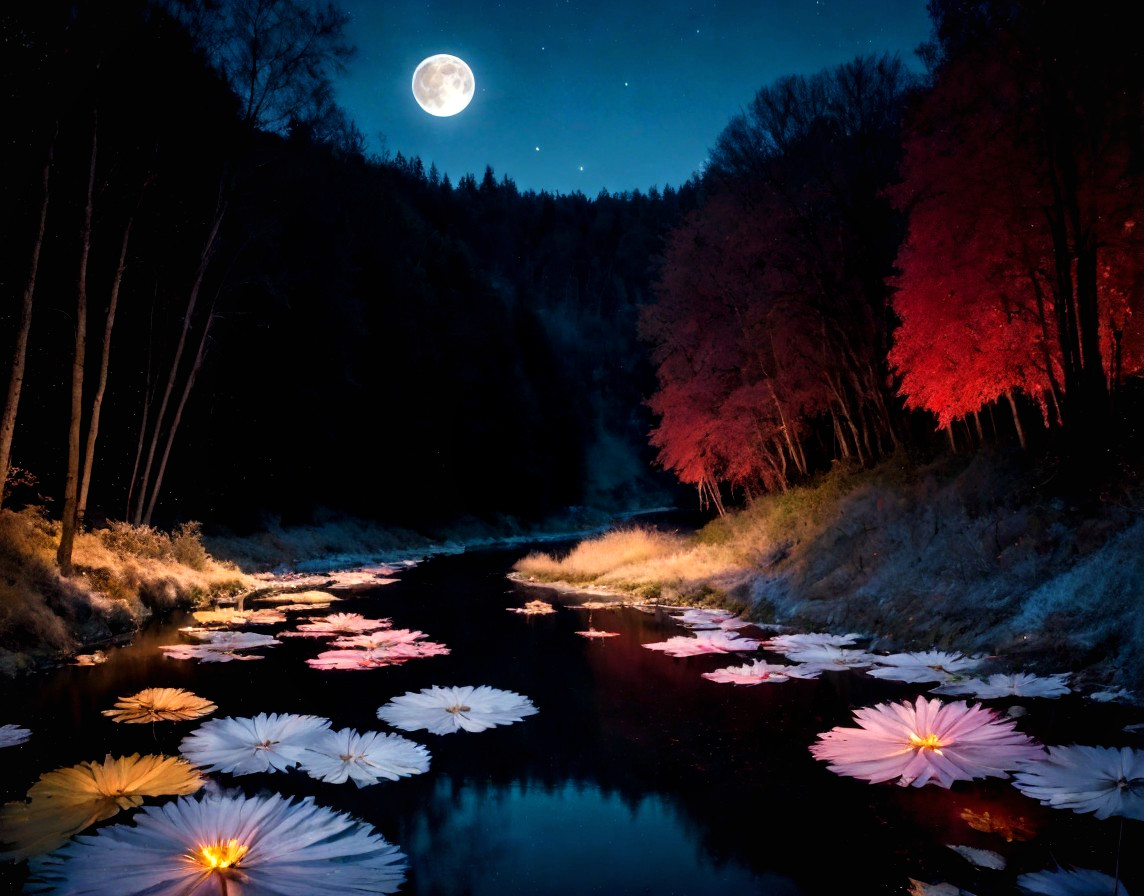 Full Moon Reflecting on Calm River with Red Trees 94w