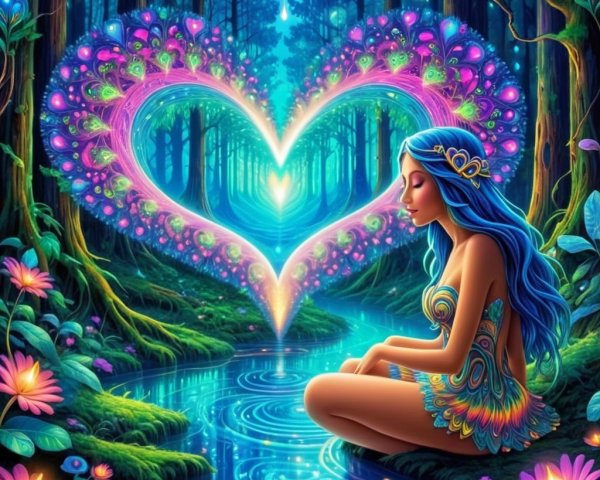 Prompt: Please paint a gorgeous opalescent rainbow-colored dove rising into the bright blue sky and surrounded by tiny orange, red, green, yellow, and white hearts. Below the flying dove is a lush green pasture in which corn and other crops are growing. A John Deere green tractor appears in the background of the pasture. Peaceful, loving vibe.