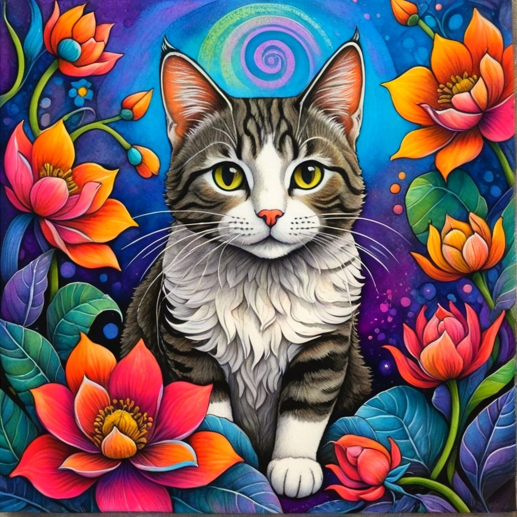 Vibrant Tabby Cat Surrounded by Lotus Flowers