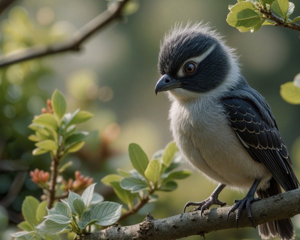 Prompt: photo of an extremely cute alien bird standing on a tree on an alien habitable planet, beautiful plants and nature, dream-like atmosphere, peaceful, serenity, , inner peace, awareness, silence, nature, evolution