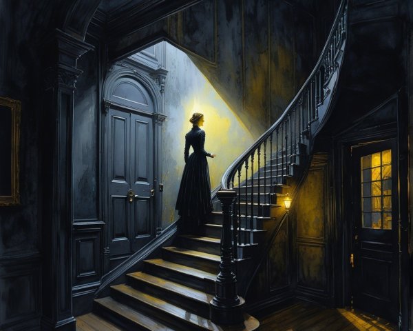 Prompt: A dark figure in human form floats up the staircase of a haunted Victorian house. Yellow glowing eyes shine from a dark corner. A detailed iIllustration in watercolor in the style of John Salminen, Jeremy Mann.