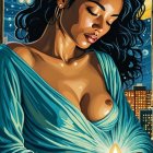 The women's skin tone is fair, and she has delicate, youthful facial features. She's wearing a flowing, intricate garment in shades of green with floral embroidery in warm colors, draping elegantly around her body. The background is adorned with aquatic plants and in the upper part with stylized clouds knwon from japanese woodcut aesthetics. Additionally, on the upper right side of the image, there's a radiant sun with an eye at its center and melting beams. The overall color palette is vibrant yet soothing, focusing on greens, blues, and warm accents.
