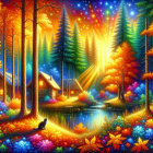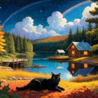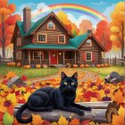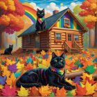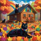 Cozy log cabin in autumn with playful cats and rainbow 2d