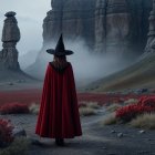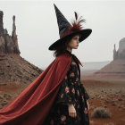 Prompt: photo of young girl dressed as witch,ornate hat with feathers,flowing red cape,dark floral dress,standing in desolate landscape,unique rock formations,misty atmosphere;high resolution,8k,cinematic lighting,sharp focus,professional photography by Gregory Crewdson,evoking mystery and enchantment