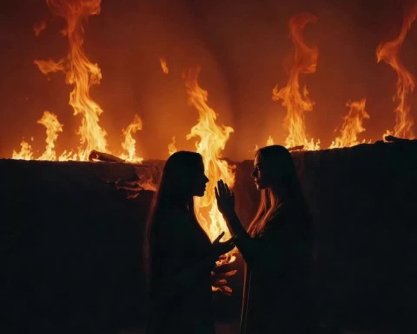 Prompt: Texture of whole picture thick, visible lines of oil paint, heavily applied with multiple layers, and visible, fine overlapping. Atmospheric masterpiece Surreal eerie sky, as bushfire on right abruptly bursts over valley with forested hills, at borders, layered hues and textures, orange-hues diffused amid , otherworldly landscape scene that features a lone figure, long hair & flowing textiles of her garment. She is standing remote and tiny, an enigmatic glorious presence created by intricate fusion of artists Anja Millen & Egon Schiele, a black silhouette against the glowing skyline, The surrounding topography contrasts multiple highly diverse textures & varied pointillism techniques . Highly detailed, dangerous dark mood; dynamic embroiled sky. Overall color palette is a mixture of dark, heavy, bleak, agate, ochre, black, grey, sandstone, slate-blue, silver, blue-cyan, silver-blue,, green-olive accents for flora with multiple orange-colored hues. Mystical firelit scene, deep colors, detailed textures, emotional depth, ,, detailed tree on skyline, with divine presence, atmospheric lighting, multi-dimensional, liminal ambiance, dark art, occult undertones, sinister allure, 8K UHD resolution, inspired, intricate composition, influences from Naoto Hattori, Gustave Dore, Beksinski, Mesmerizing MC Escher enigmatic art in precise geometric & linear precision , Aubrey Beardsley, Eldritch,,jacek yerka high detail, enhanced textures. Pointillism, Abstract pointillism, textured pointillism, layered pointillism, 3D pointillism particles in following colors: orange, burnt-orange, , neon-black-orange, , copper, brass, orange, bronze, terracotta, , rust, caramel, brown, dark brown, chocolate-brown; multi-layered, oil paint thickly and delicate lines as colours overlap, Layered intricacies, hyper-maximalism textured pointillism multidimensional painting texturized painting hyper-detailed textures