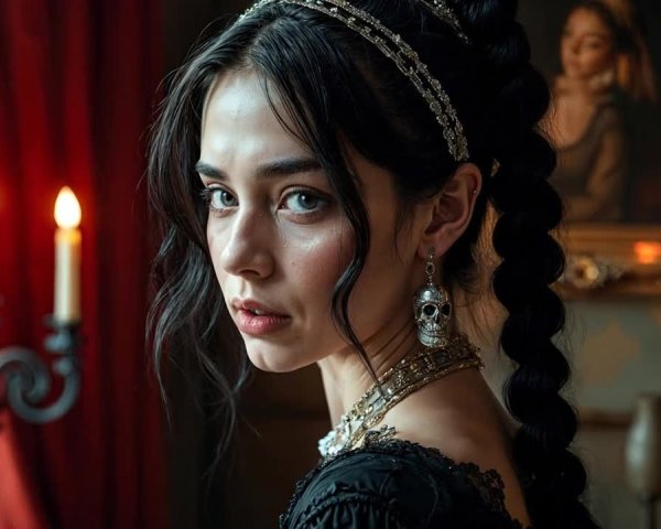 Prompt: A captivating 3D render of two majestic black knights on black horses, fully adorned in intricately designed gothic armor, engaged in a spirited joust. In the backdrop, a serene medieval maiden with gentle facial features, dark skin, and long flowing hair, wearing traditional medieval accessories, gazes intently. The background features a swirling, ethereal atmosphere of black and grey interwoven with undulating red curving lines and bold black strokes, illuminated by an inner glow of nocturnal lights. This scene masterfully blends Olivia De Berardinis’ sensuality, Thomas Kinkade’s dramatic chiaroscuro, Greg Rutkowski’s mystical aura, and Alphonse Mucha’s Art Nouveau elegance, rendered with cinematic lighting and vivid, dynamic colors.