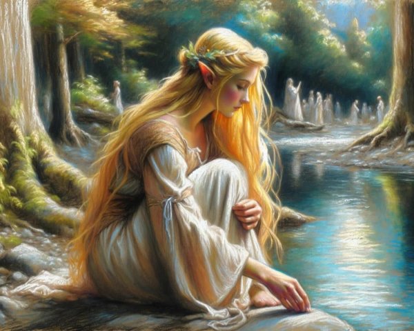 Prompt: In the style of Nathalie Picoulet, an awe-inspiring watercolor painting transports viewers to a magical forest. At the center of this enchanting scene stands a breathtakingly beautiful woman, her ethereal presence suffused with the essence of nature. Delicate brushstrokes depict her flowing hair intertwined with vibrant wildflowers, each petal meticulously detailed. Her emerald eyes emanate a captivating radiance, perfectly mirroring the lush greenery surrounding her. This meticulously crafted image evokes a sense of wonder, inviting spectators to explore the mystical world captured within this stunning watercolor masterpiece.