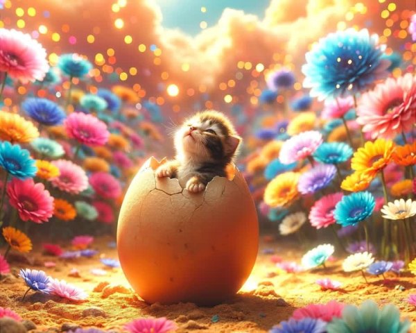 Prompt: A masterpiece of fragmented neon 3D cubism. A glowing pink and light blue chameleon amidst luminous green grass and whimsical glowing yellow flowers. A light mist creates a color-diffusion effect. A dark evening sky with glowing multicolored stars and a luminous new moon of light blue. Full-size image.