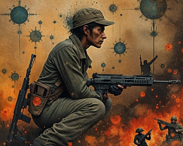 Prompt: (A masterpiece of unparalleled excellence), This is a stunning full body portrait, created in the patchwork style of Takato Yamamoto, Catrin Welz-Stein, Dee Nickerson and Luis Royo.((A silhouetted figure with a body painted in circuit patterns stands against a vibrant, abstract background of swirling colors in blue, yellow, red, and orange, symbolizing technology and creativity)). Full Length image.