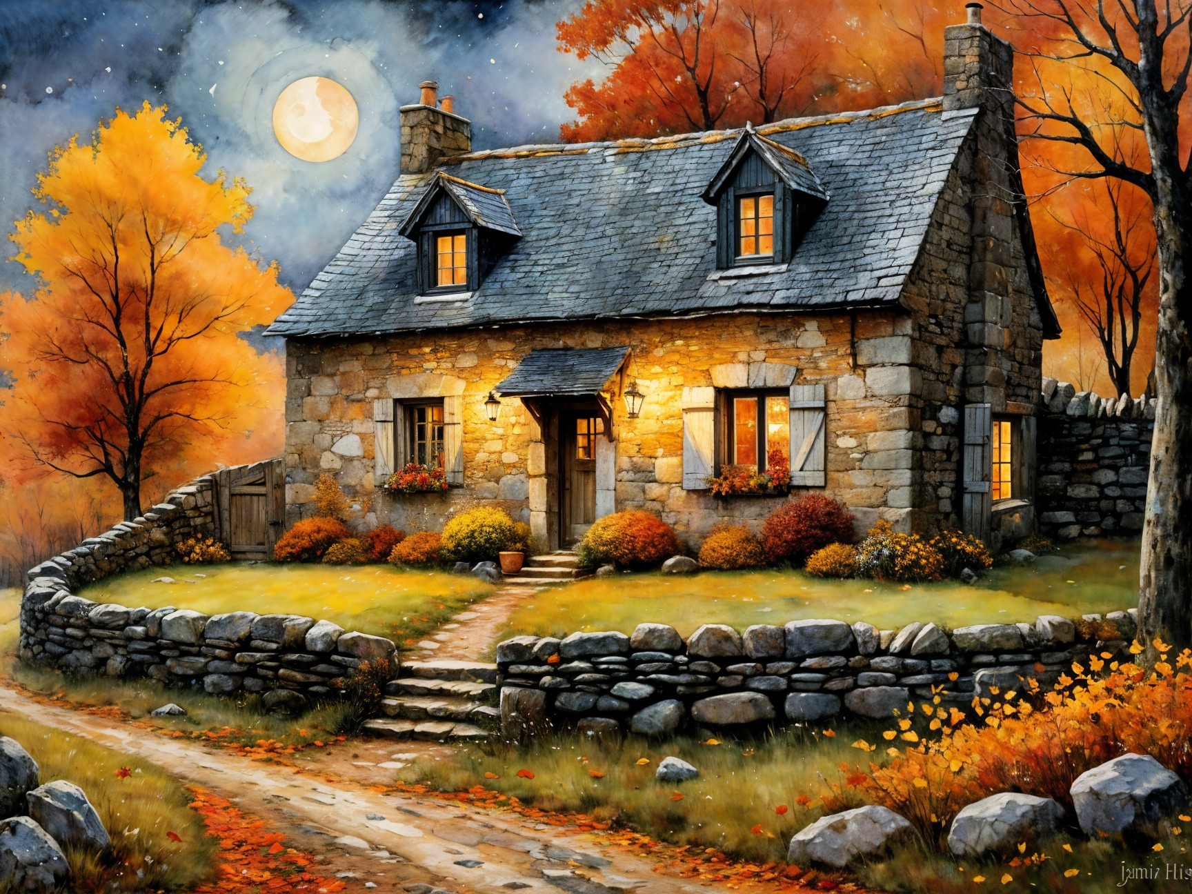 Prompt: a rustic old stone cottage with lights on, in an Autumn landscape. a patchwork art by Jamie heiden, peter doig, Renoir, pol Ledent, endre penovac, Gustave Loiseau, Arthur Rackham, Doug Chinnery, Maud Lewis. inlay, watercolors and ink, beautiful, fantastic view, extremely detailed, intricate, best quality, highest definition, rich colours. intricate beautiful dynamic lighting award winning fantastic view ultra detailed 4K 3D high definition hdr elegant intricate beautiful award winning fantastic view ultra detailed. nebula atmospheric