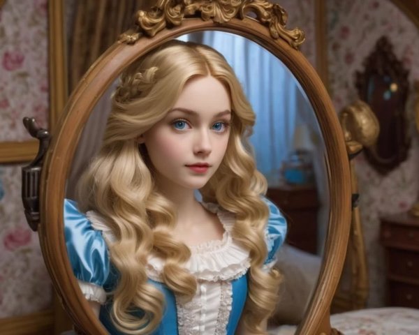 Prompt: A magical scene centered around an ornate, vintage music box that is opened, revealing a miniature fairytale castle inside. This castle should have whimsical spires and details, surrounded by sparkling dust and soft golden light. Five tiny ballet dancers are gracefully twirling above the music box, with musical notes floating around them. The setting is a warmly lit, luxurious room with rich textures: dark wood furniture, an elaborate gold candelabra with lit candles casting a gentle glow, and a large window in the background, showcasing intricate patterns and sunlight streaming through, creating an enchanting atmosphere. The color palette should include warm tones of gold, brown, and soft pastels to evoke a sense of nostalgia and wonder. Ensure the composition balances the foreground and background effectively, drawing the viewer's attention to the music box and its magical contents. Emphasize the details in the dancers' costumes and the intricate designs on the box and candleholder, while maintaining a dreamlike quality throughout the image.