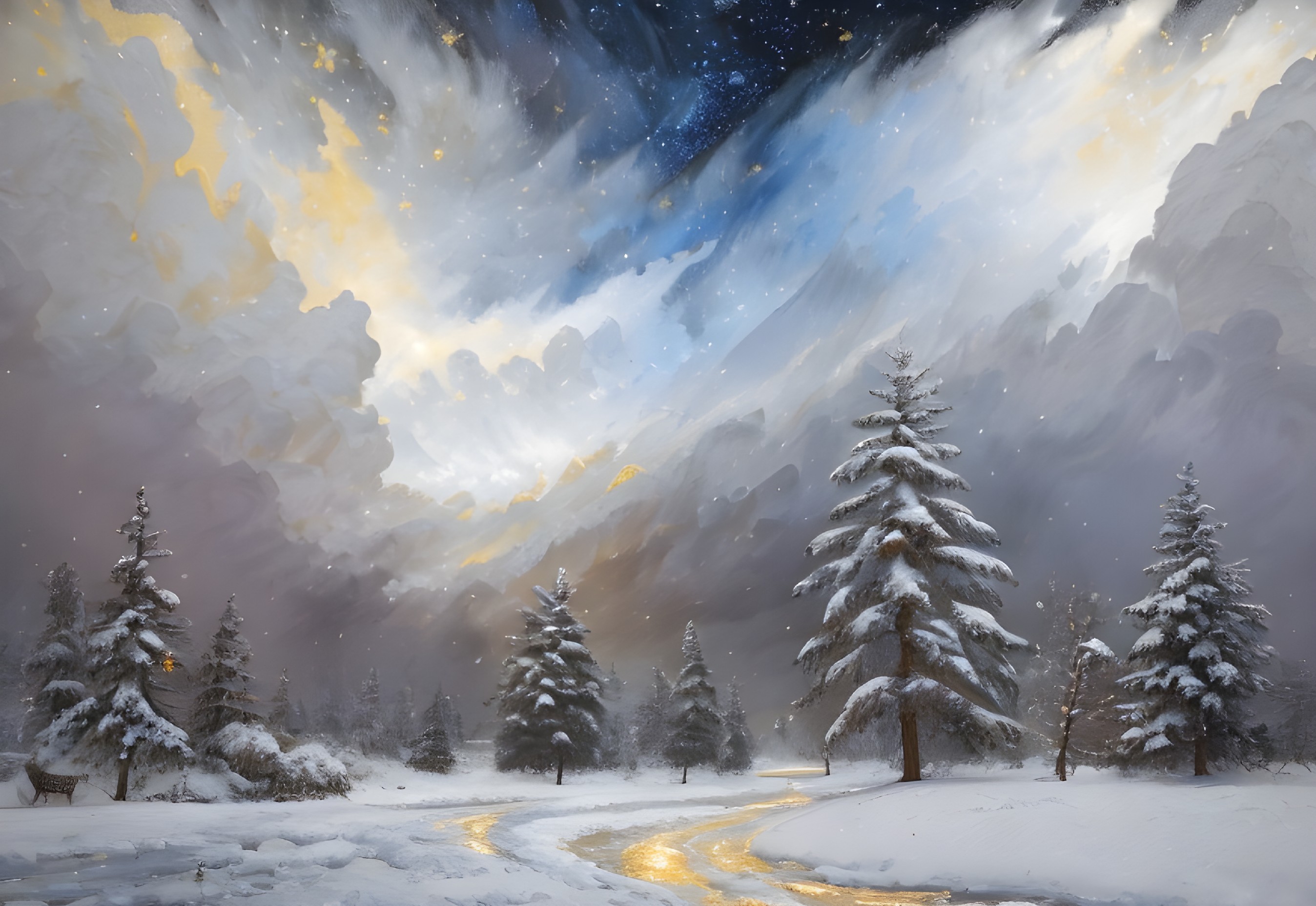• Prompt: Silver snowflakes, gold stars, speed painting using acrylic gouache and deeply thick oil-on-oil square bold strokes, highly detailed maximalist composition, multi point perspective cubism, a greater range of DoF and sensitivity, techniques used in sequence: background of windswept winter snowscape and Nordic patchwork, dry brush technique by Jean Baptiste Monge, Lluis Bruguera, Darek Zabrocki, Hernan Bas, Gerhard Richter; avant-impasto middleground palette knife by Van Gogh, Gustav Klimt, Susanne Loose, Loui Jover, Michelangelo; in the foreground the edges are harder sharper crisper creating more definition by Michael Parkes, Tomasz Alen, Micheal Cheval, Nelson Boren, Alex Alemany, Daniel Gerhartz, Patrick Woodroffe, QLED 8K.