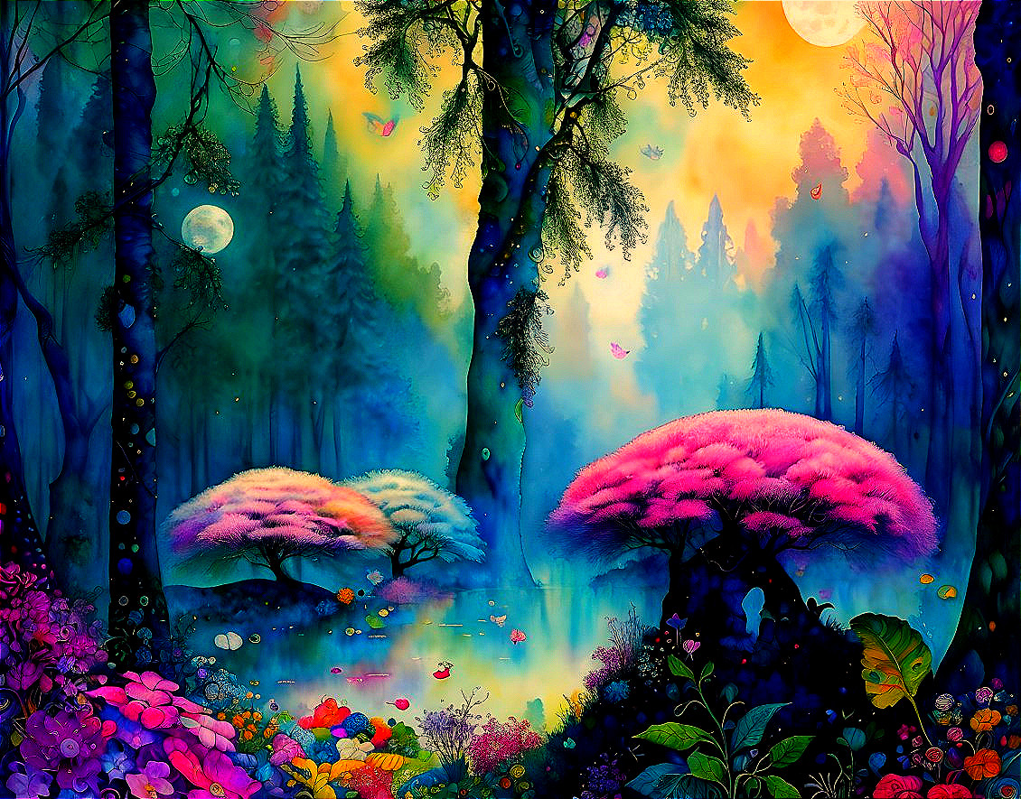 Colorful forest painting with red, orange, and blue trees by a serene river