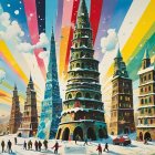 Prompt: A whimsical, magical wintery landscape with surreal looking christmas trees covered in snow and sparkling multi-colored lights. It is dusk, with sparkly stars in the sky along with beautiful snowflakes falling. The path is iridescent with reflective and shiny opal colors. psychedelic digital designs composed of swirls and curls, digital art. The flora and bushes on the ground are intricate fractal designs resembling flowers and snowflakes, swirling patterns with sparkly textures. intricately layered flowers Two small glowing gold pixies are flying near the top of the center tree. Layering and glazing technique, Zentangle style, wide panoramic view, glitter, extremely detailed and intricate, Reflective and Iridescent, quilling technique. Add purple hues to the lights in the trees and also onto the iridescent shiny path. Surrealism style, expressive hard brush strokes, textured oil on canvas, thick palette knife technique, intricate details