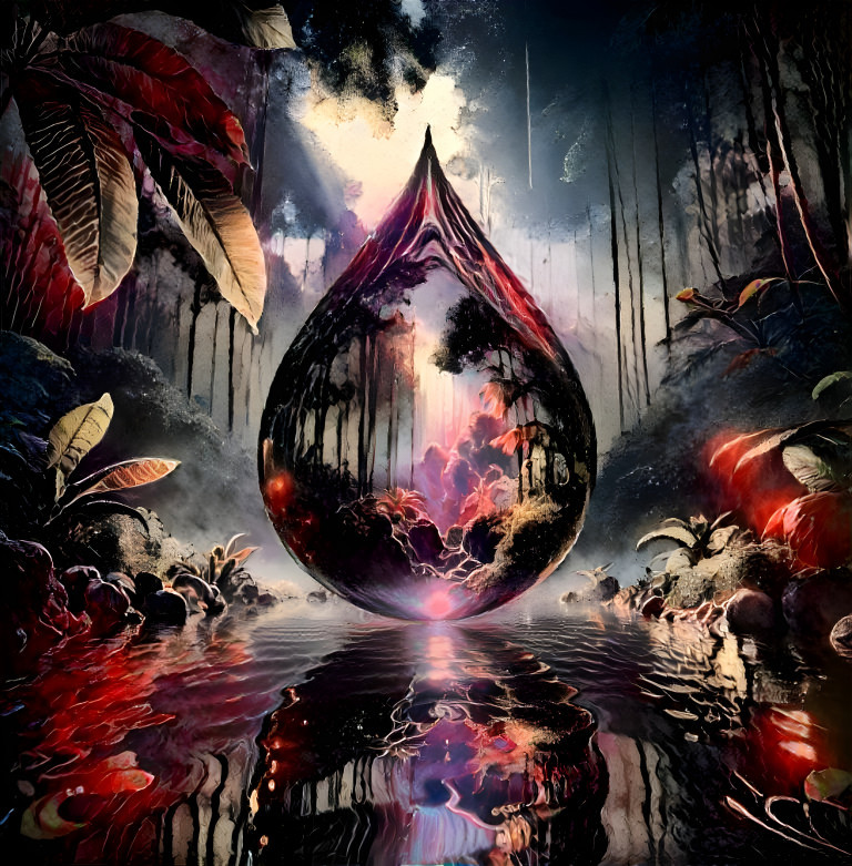 Prompt: The best AI generated artwork of intensified, a bird inside a raindrop on Focus. Rainforest in the background, sun setting, centred, bold colours