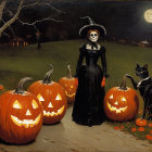 Prompt: Dark gothic fantasy street scene in an ancient old town, hyper-detailed and cinematic. A weathered two-story stone house with worn teal doors and cracked windows stands among twisted, leafless trees. Black iron lanterns cast dim golden light, flickering across rain-slick cobblestones that reflect like pools of liquid shadow. Heavy mist rolls through the alley, swallowing distant figures into mystery. The sky burns with dramatic chiaroscuro — storm-tossed clouds in crimson, deep indigo, and smoldering ember tones — swirling like a painted baroque ceiling. Climbing vines twist like black veins against the stone walls, while wilted flowers spill from broken pots. The entire atmosphere is moody, gothic, and theatrical, layered with texture, fog, and volumetric light beams cutting through shadow. Painterly yet ultra-realistic, inspired by Caravaggio’s light and shadow, with hints of Brian Froud’s eerie fantasy and Ghibli’s depth, but in a darker, baroque palette. HDR intensity, strong contrasts, gothic ambience, glowing halloween pumpkins before the house, black cat comming up the road