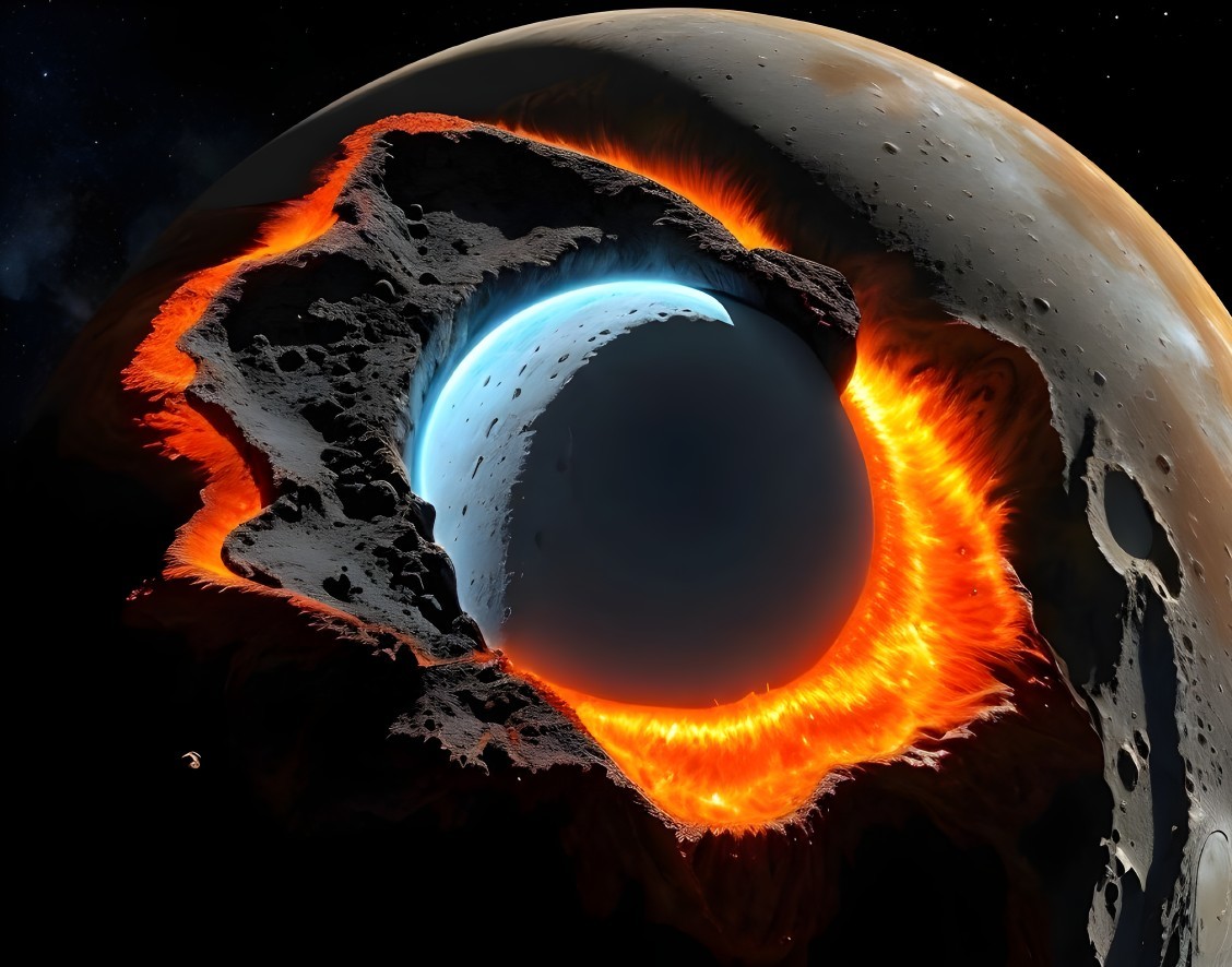 Prompt: The image captures a picturesque moment in a desert landscape, with a large pinkish-red moon seen through a natural arch in the rock formation. The sky above the arch is a blend of deep blue and soft pink, hinting at either a sunrise or sunset.