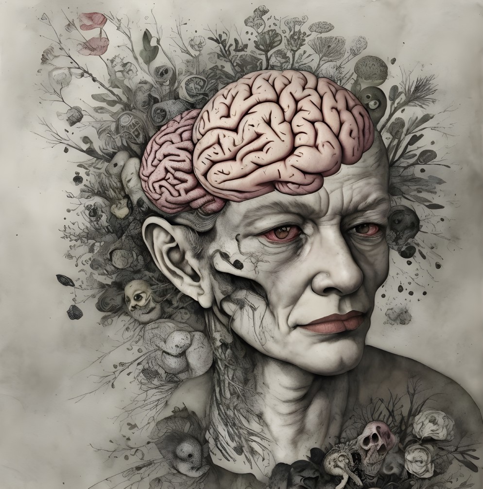 Prompt: The image portrays an artistic representation, possibly a piece of abstract or expressionist art featuring a female figure as the central subject. The woman is depicted with exaggerated features and expressive eyes, suggesting emphasis on emotion rather than realistic portrayal.