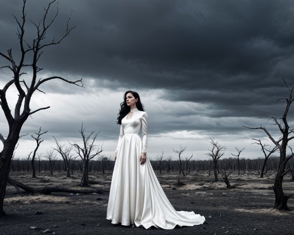 Prompt: Looming over the city skyline, a colossal female model figure strides forward, her gothic lolita dress billowing in the wind. Her features are exotic, eyes glowing with an otherworldly intensity. Tiny figures of people scatter in terror below as she reaches down to grasp at buildings, her hands easily crushing concrete and steel. Is she a force of nature, a mythical being, an alien from space, a failed experiment, or something more? The viewer is left to ponder the story behind this apocalyptic scene.