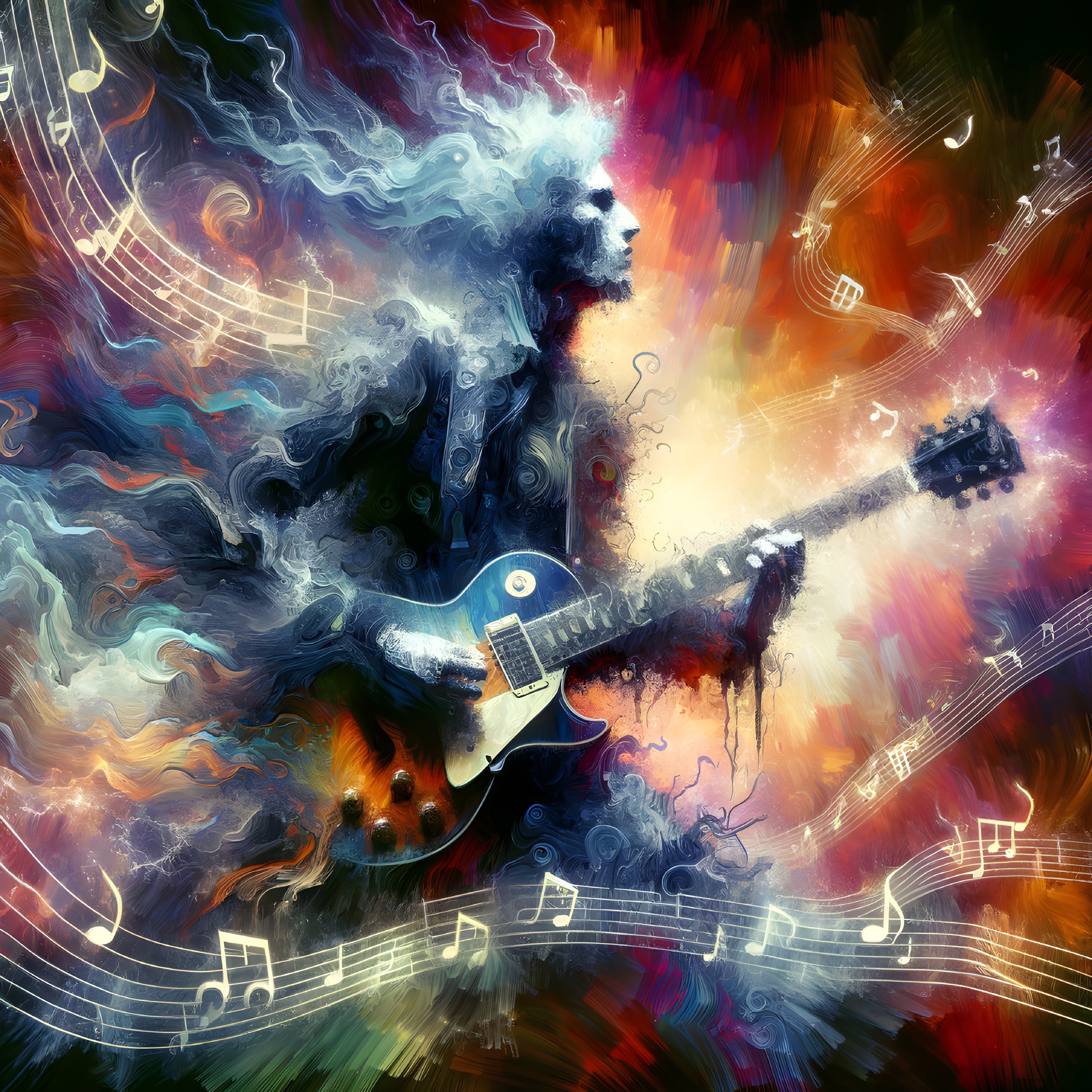 Prompt: electric poltergeist "guitar" rocker outline visuals, Digital double exposure disintegrating dissolving music notes Illustration by Tran Nguyen Jeremy Mann Frank Frazetta Carne Griffiths, WLOP Stylized watercolor art, Intricate, Complex contrast, HDR, Sharp, soft Cinematic Volumetric lighting, stylized mixed media film colours, wide long shot, perfect masterpiece