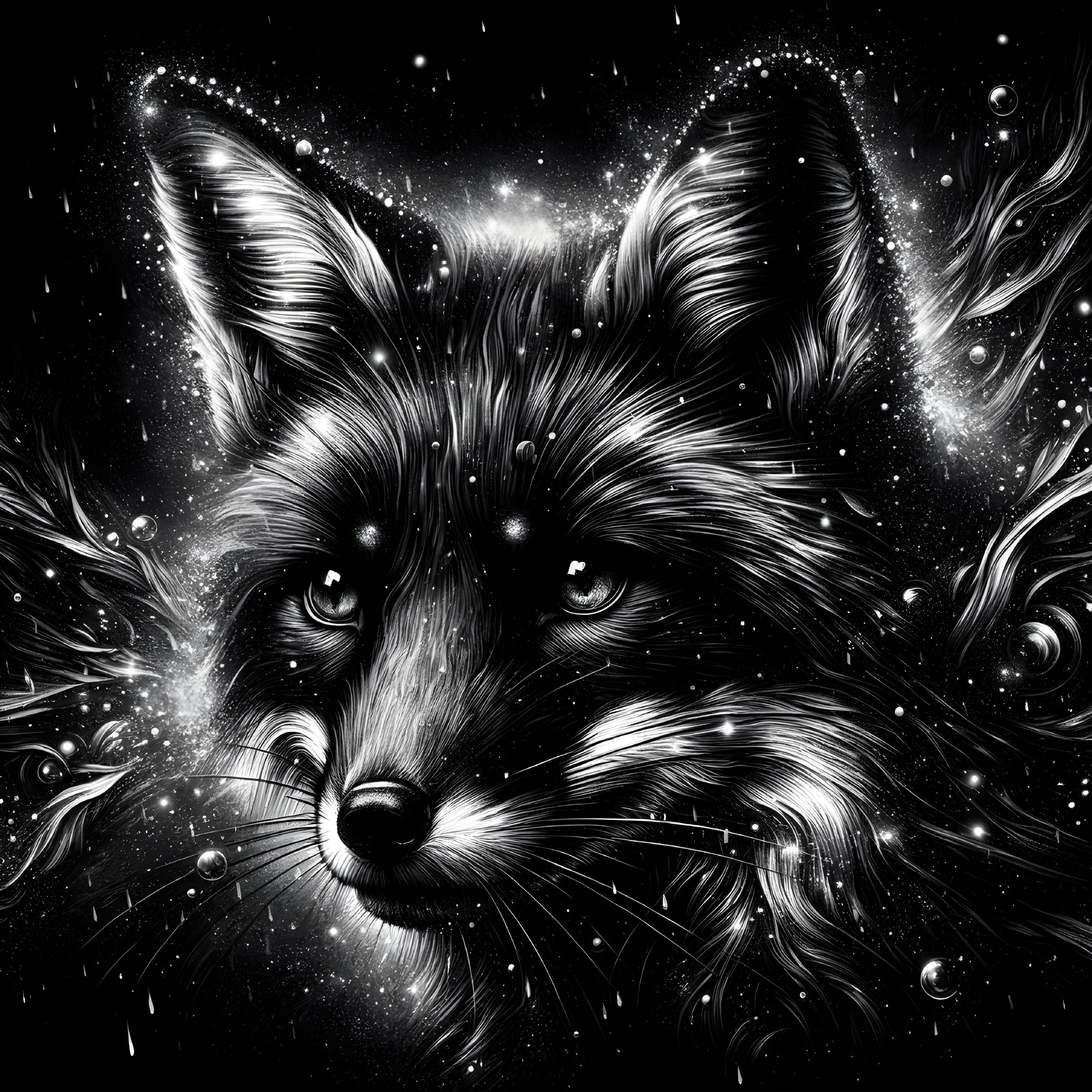 Prompt: Black fox in the rain, black background, black droplets, black luminescence, portrait, intricate details 8k resolution holographic astral cosmic illustration mixed media by Pablo Amaringo