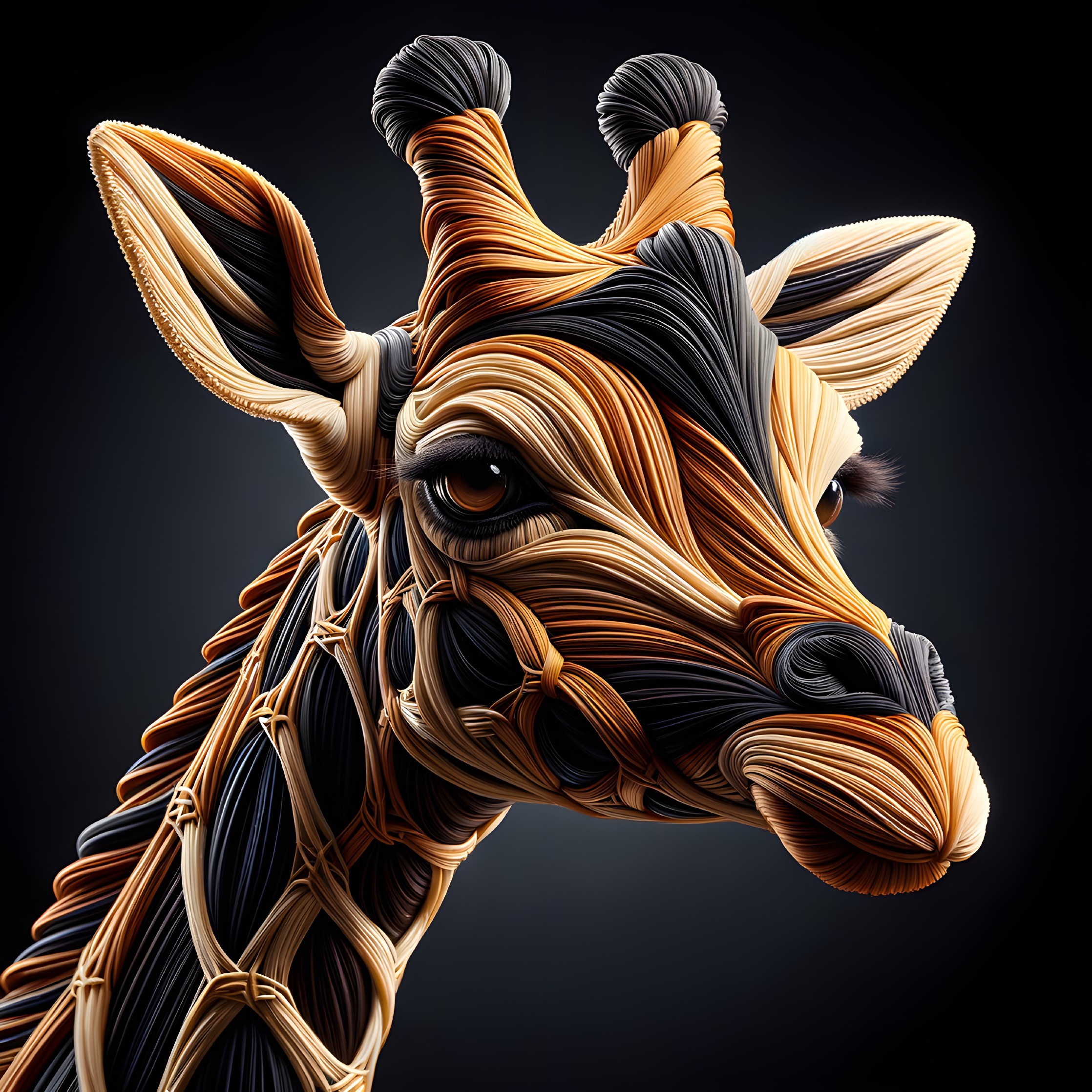 Prompt: {a portrait of a giraffe head facing forward made of silk ribbons, centered, symmetrical}; picture a network of struts for supports that outline the giraffe; the network should be airy and not densely packed, only hinting at the giraffe's shape, revealing that the giraffe is completely hollow, the struts should be silk ribbons of varying widths painted indifferent shades of brown, black, tan and white