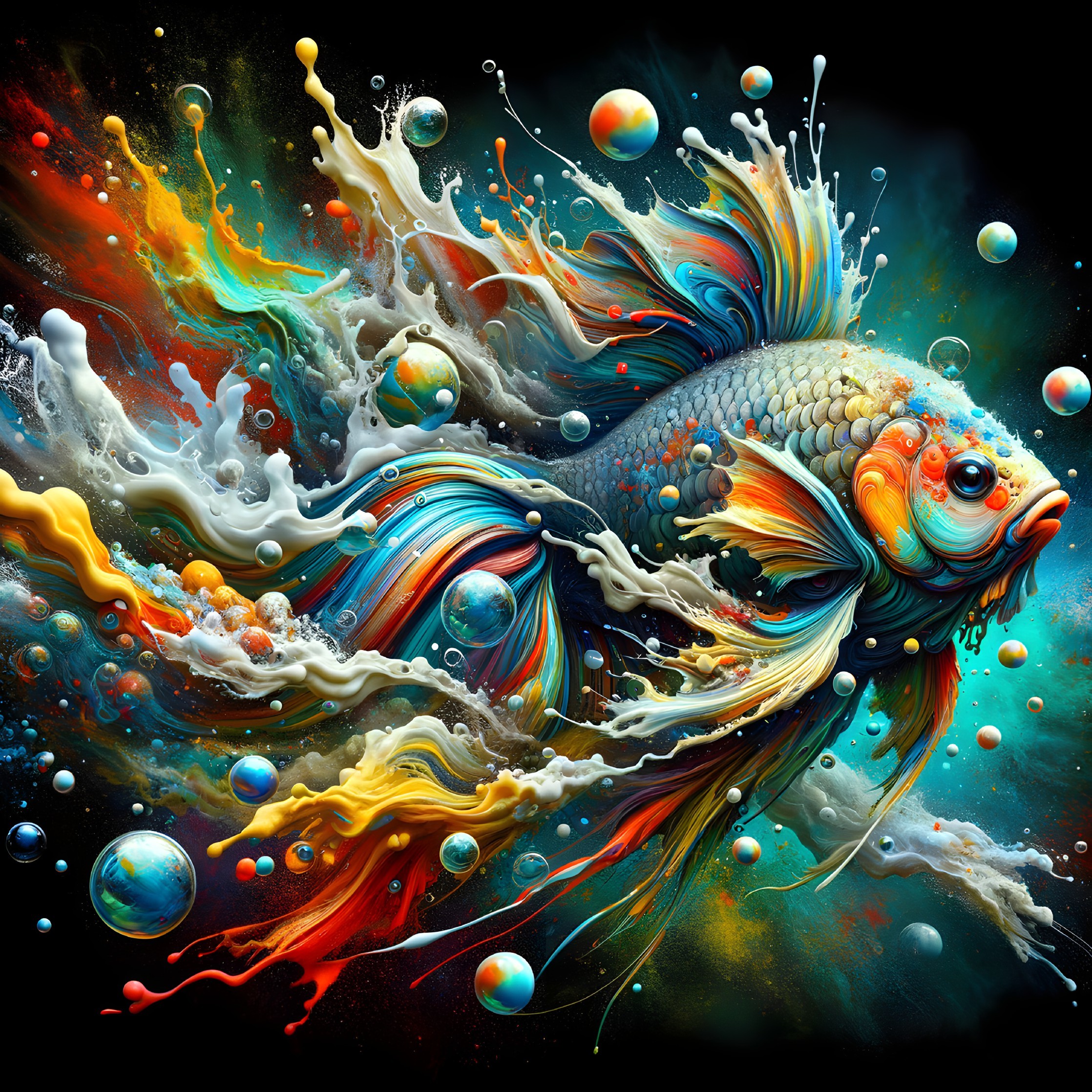 Prompt: an amazing swimming fish, where sea life and bubbles unite in a surreal swirl of fascination and stylishness, 8k resolution trending on Artstation Unreal Engine 5, graffiti art, splash art, street art, spray paint, oil gouache melting, acrylic, high contrast, colourful, ultra-detailed, ultra quality, CGSociety