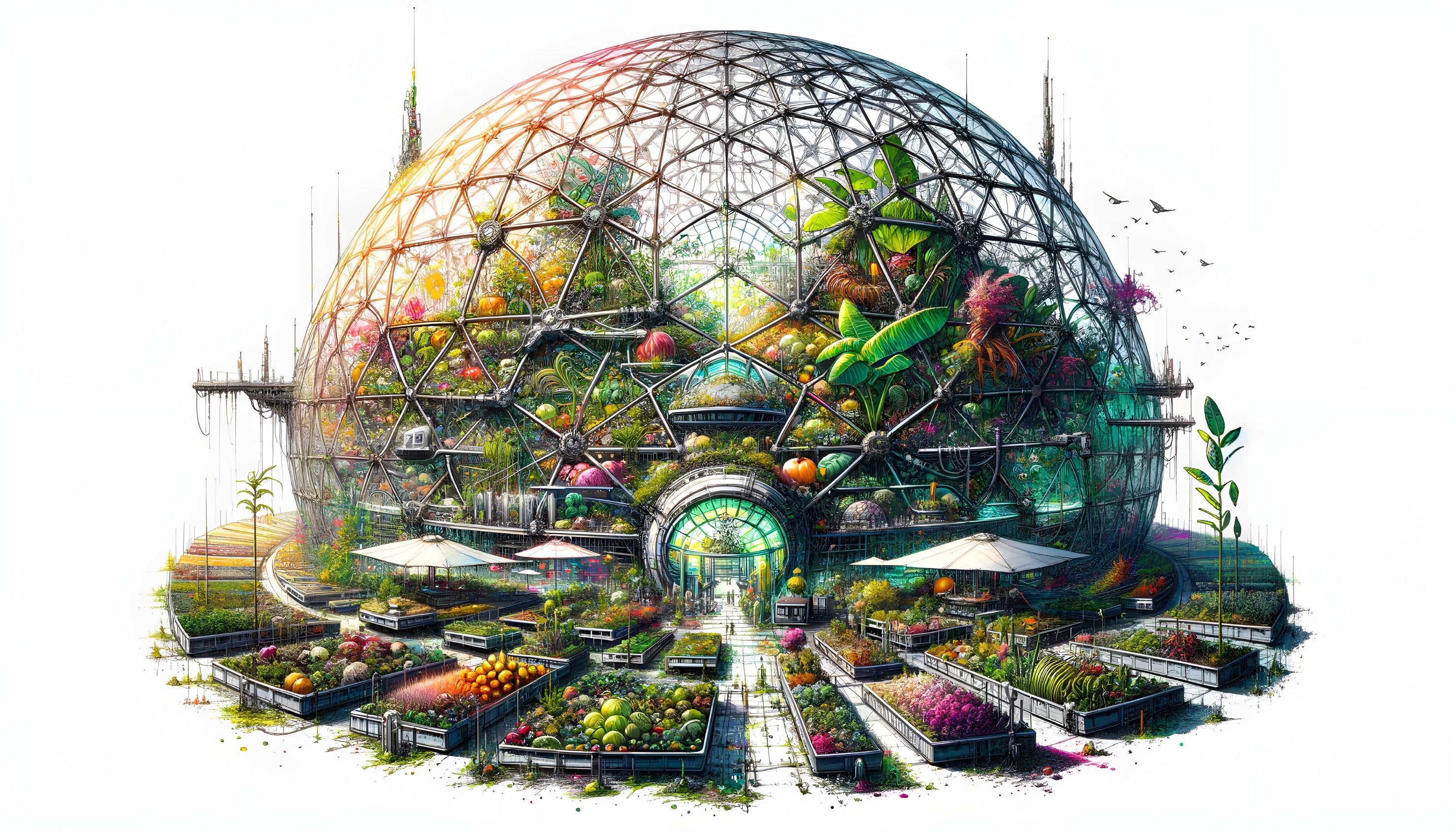 Prompt: Thick ink drawing of a sci fi style solar punk green punk vegetable punk fruit punk berry punk botanical garden in a solar punk dome filled with a variety of plant life. Thick string lines, vibrant, splash of color, masterpiece