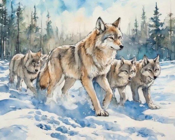Prompt: Exquisite wolf hunting and forming fluid full-body portrait, incorporating elements of snowy pine trees and mountainous landscapes, highly detailed sketching, ethereal liquid flowing body effect, and earthy pastel palette, digital painting, ultra fine, vivid colors, highly detailed, double exposure