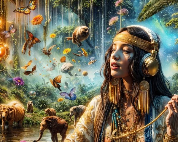 Prompt: (A masterpiece of unparalleled excellence), This is a stunning and colorful close up image, created in the patchwork style of Gustav Klimt, Nicoletta Ceccoli, Catrin Welz-Stein, Dee Nickerson, Luis Royo. ((Amid the tapestry of nature’s enchantment, a beautiful female figure sits gracefully upon a towering branch—poised like an ethereal guardian of the forest. Draped in flowing pink fabric, their presence is both delicate and majestic, embodying a fusion of elegance and mystery. The soft off-the-shoulder sleeves whisper of timeless beauty, as the ambient hues of green and pink leaves weave a dreamlike atmosphere around them. Light dances through the foliage, casting gentle shadows that deepen the magic of the scene. It is a vision suspended between reality and fantasy—a moment where nature and artistry entwine in harmonious splendor)). Full size image.