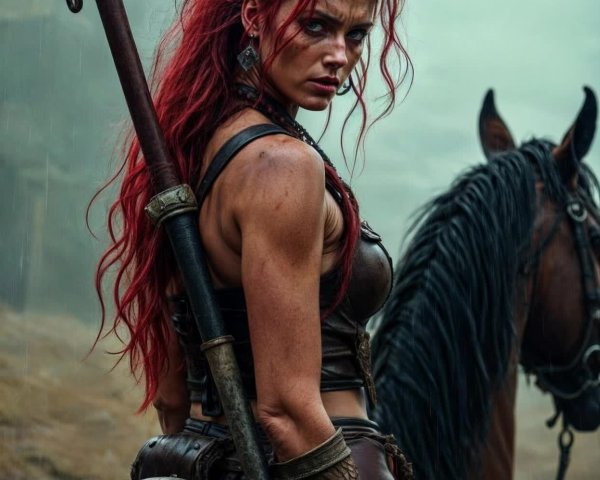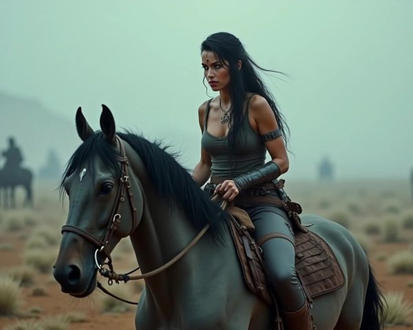 Prompt: anatomically correct tattooed female hells angel biker, dressed in tshirt and denim shorts. her bike is drawn with accurate proportions, a surrealistic landscape, with swirling stormy skies. styles of Botticelli, Raulo Cáceres. vegetation by Henri Rousseau. colours of blue, gold, red, and slate grey.