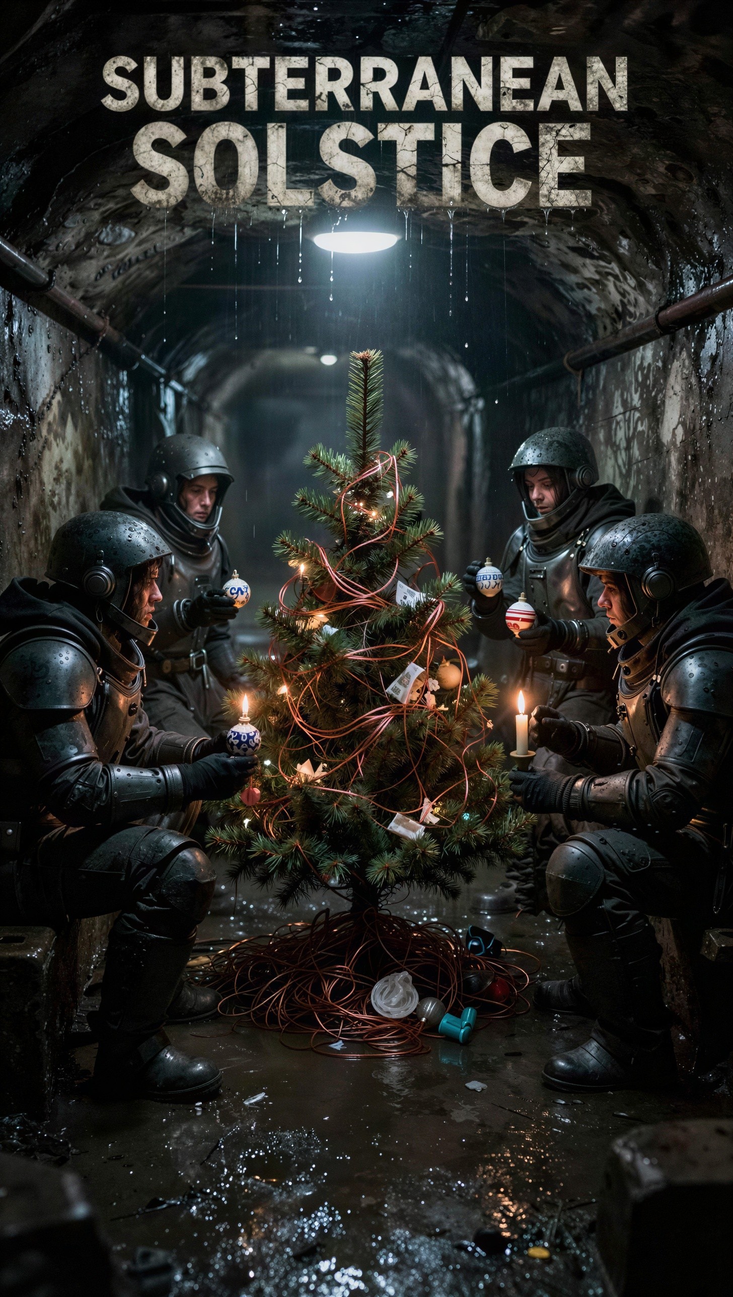 Prompt: A low-angle, cinematic full-shot ultra-detailed photograph of five heavily armored survivors sitting around a small, pitiful Christmas tree made of tangled copper wire and plastic debris inside a dark, flooded subway tunnel. The tree is lit by one weak, flickering candle. Each survivor is holding a single, broken piece of a ceramic ornament. Water drips from the ceiling, reflecting the weak light. The artist's signature "@digo.a.i" is visible scratched into the tunnel wall. The overall ambiance is intimate, desperate, and cold. The text "SUBTERRANEAN SOLSTICE" is visible in the top center with water-stained, cracked stone typography. Extreme detail on wet metal and shadows, high contrast, volumetric water vapor, 8K.