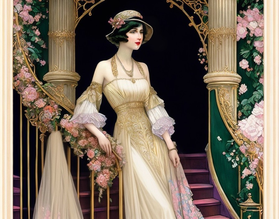 Elegant Woman on Ornate Staircase in Vintage Gown