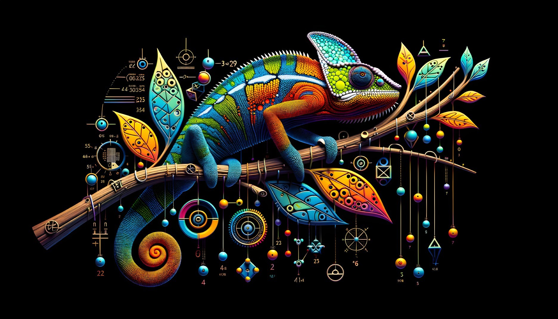 • Prompt: striking conceptual art piece featuring a chameleon perched on a unique branch adorned with geometric shapes reminiscent of Yayoi Kusama's dot art and Victor Vasarely's optical art. The chameleon's vibrant skin blends seamlessly with the colorful branch, which consists of number symbols, measuring tools, and other abstract elements. The black background emphasizes the contrast and intricacy of the design, while the 3D render gives the illustration a modern and futuristic feel., illustration, 3d render, conceptual art