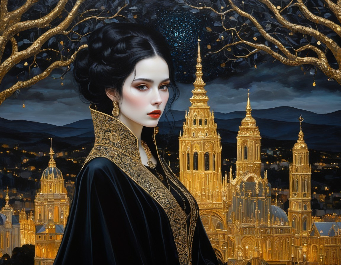 Woman in Black Cloak Against Golden Architecture