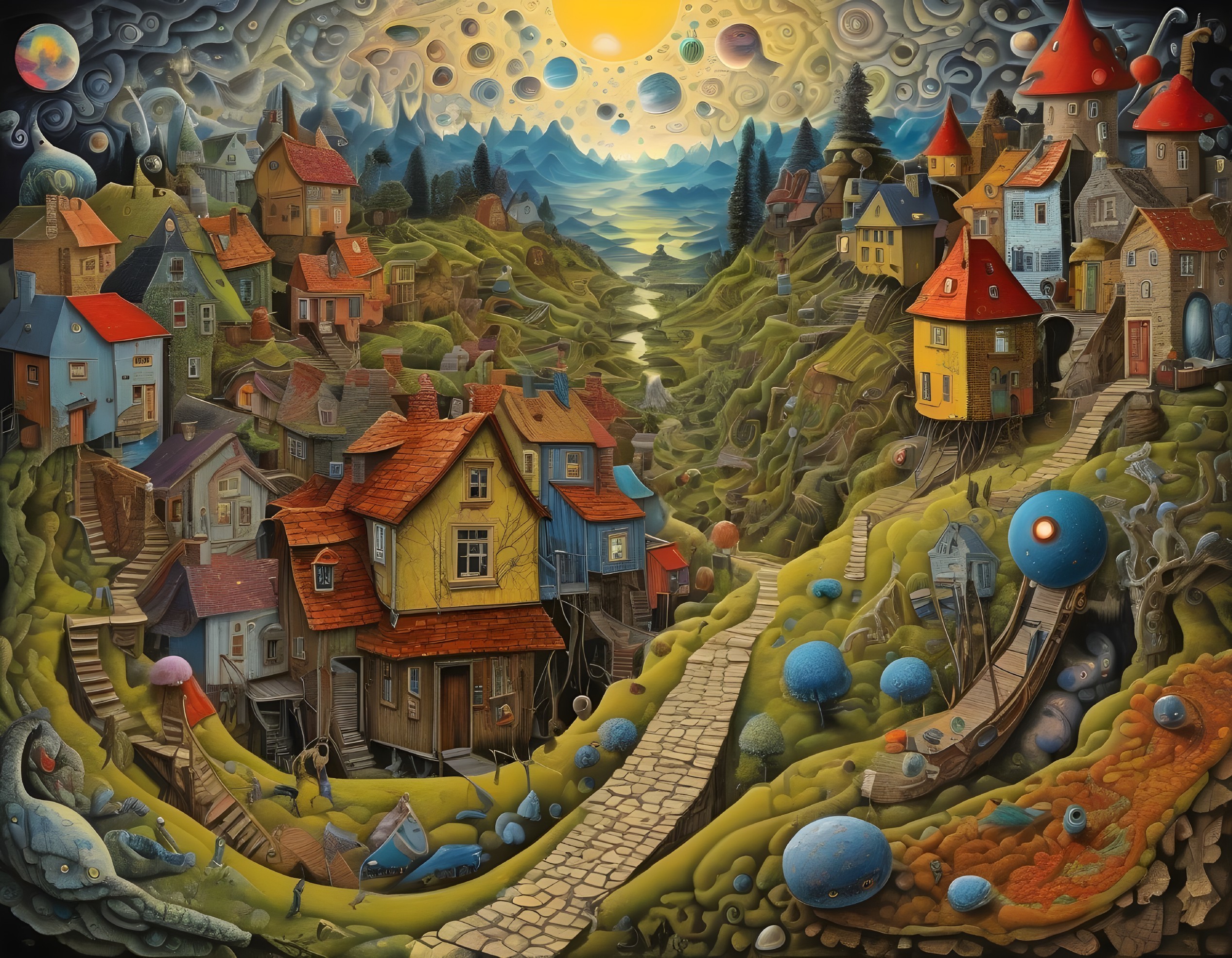 Whimsical Landscape with Colorful Houses and Surreal Elements