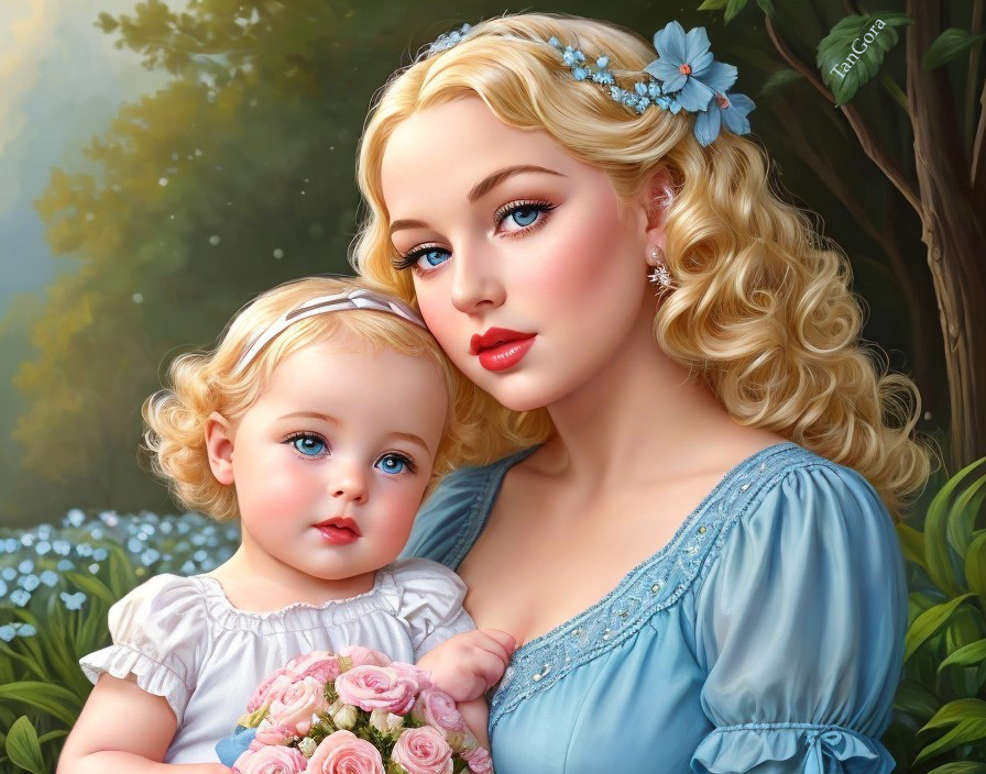 Mother and Daughter in Lush Greenery with Roses