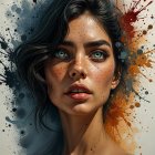 Her face, fully revealed, is striking and expressive: Mediterranean features softened by chaos, full lips painted in deep crimson (Pantone 1797 C), high cheekbones emerging from splattered ink textures, and electric hazel eyes (Pantone 7499 C flecked with Pantone 320 C teal) that cut through the turbulence with clarity. Her long dark hair, wavy and tumbling, disintegrates outward into violent brush strokes, splashes of black ink, and streaks of crimson, as if the strands themselves were unraveling into abstract motion.