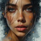 Her hair is a striking pixie cut—deep black (Pantone Black 6 C), asymmetrical and aggressively layered—scattered in sharp, jagged strokes that explode outward, disintegrating into the chaos of paint trails and ink splashes. Each lock feels alive, blending into the painterly storm, yet sharply defining the rebellious geometry of her look.