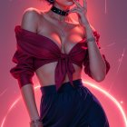 The overall palette combines deep blacks, bold reds, and neon accents with the soft gradient of her blonde-to-pink hair, creating a scene that is fierce, dynamic, and provocatively gothic.