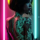 Her skin is a deep anthracite tone (Pantone 447 C), polished with spectral highlights that suggest moonlight on wet stone. Her entire body is covered in intricate glowing tattoos that resemble bioluminescent flora: phosphorescent orchids (Pantone 806 C Neon Pink), curling jungle vines in electric cyan (Pantone 2995 C), serrated palm fronds in neon lime (Pantone 2290 C), and blossoms of radiant ultraviolet lilies (Pantone 813 C Fluorescent Violet). The tattoos emit their own eerie glow, casting faint reflections onto her skin, as if she is alive with a garden of living light.