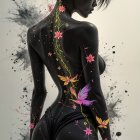 Her skin is rendered in deep anthracite (Pantone 447 C), but across it blooms an impossible garden of glowing tattoos that seem alive, shifting like living fractals. Bioluminescent vines in neon turquoise (Pantone 312 C) coil upward, punctuated by surreal blossoms of fluorescent magenta lotuses (Pantone 806 C) and golden-orange lilies (Pantone 1375 C). Intertwined among them, stylized hummingbirds in radiant lime green (Pantone 802 C) and cobalt blue (Pantone 2935 C) appear mid-flight, glowing as if tattooed with living light. The tattoos do not simply sit on her skin—they ripple, blur, and drift outward, as though peeling away to become real in the space around her.