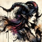 Her hair is jet black (Pantone Black 6 C) streaked with violent brush splatters of red (Pantone 7625 C) and cobalt blue (Pantone 286 C), strands breaking apart into chaotic lines as if blown apart by the very energy of the canvas. The background is minimal but electrified: a field of stark white fractured by heavy black strokes and bursts of ink, arcs of scarlet and indigo slashing through space, some spilling across her body so that she seems both painted and alive.