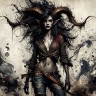 Prompt: A hybrid-style full-body illustration fuses hyperrealism, explosive graphic abstraction, and haunting surrealism, capturing a modern, sensual yet unsettling woman.