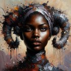 She wears an elegant black silk turban (Pantone Black 6 C), sculpted with almost marble-like folds, yet infused with painterly energy where edges blur into abstract splatters. The fabric is refined with delicate metallic cherry-red filigree (Pantone 7622 C), subtle yet luxurious, shimmering like faint veins of precious metal woven through darkness. Her hair, mostly concealed beneath the turban, spills out slightly at the temples in loose, wavy strands of deep jet black with a bronze sheen (Pantone 440 C + Pantone 876 C), adding a natural counterpoint to the ornamentation.