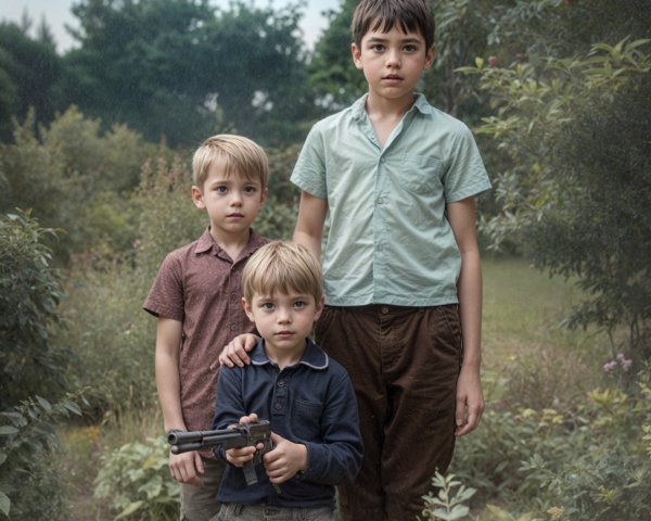 Prompt: Three young boys are posing in a garden with trees and shrubs in the background. The smallest boy is holding a toy colt gun. Background with green vegetation is out of focus. Colours are all very natural.