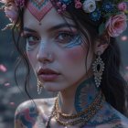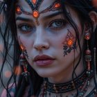 Prompt: In an ethereal blend of surrealism and enchantment, a cosmic color palette swirls around an Amazon warrior in an enchanted forest, adorned with intricate tattoos and tribal patterns that exude spiritual symbolism. The artwork, reminiscent of Dan Quintana's style, features a gothic allure and dramatic lighting that create a shamanic portrait with ultra-realistic details and mesmerizingly large eyes. An albino figure stands out amidst this surreal scene, with water drop ink effects cascading down a chevron-patterned dress, showcasing Artstation-worthy textures. Inspired by vintage surrealism and African artists like Yinka Shonibare, the piece captures a post-apocalyptic desert landscape tinged with cyberpunk elements, blending HDR 8k/4k resolution with nostalgic light leaks and mysterious creatures lurking in swirling sands.