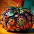 Prompt: Create an image of a woman with long, flowing auburn hair styled in loose waves and braids, standing with her back to the viewer. She is wearing a vibrant dress adorned with a multitude of colorful flowers in various shades, including blues, purples, yellows, and reds, blending seamlessly into a lush, flower-filled landscape. The background features majestic mountains under a starry night sky, illuminated by a large, glowing moon. The scene is rich in detail, capturing the textures of the flowers and the whimsical, artistic style of the setting. The overall atmosphere should evoke a sense of magic and tranquility, with the colors enhancing the beauty of the natural scene.