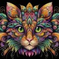 Prompt: Create an image with an intricately detailed, vibrant garden scene at twilight. The setting features a mesmerizing, radiant sky blending hues of pink, orange, and purple behind silhouetted, intertwining tree branches that create a natural frame around the sky. Below, a lush and diverse array of flowers blooms boldly in full color. Visible are clusters of snowdrops with white petals and green-dotted tips, interspersed with crimson poppies and white flowers with prominent yellow centers. Sprigs of blue and purple flowers add to the diversity, alongside grape hyacinth-like flowers with rich purple tones. Amid the foliage, a black cat with striking green eyes peers out curiously, its head emerging between flowers to gaze directly at the viewer. The foreground includes brown autumn leaves, adding a touch of early spring feel to the scene. The overall composition is vivid, with a magical and slightly fantastical atmosphere.