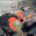 Prompt: A serene, snowy scene featuring a majestic white rabbit with intricately detailed swirling patterns on its fur, positioned prominently on a soft, white snow blanket. The rabbit's large ears are perked up, and its expressive face, with gentle features and whiskers, gazes thoughtfully towards the left. In the background, a starry night sky is illuminated by two decorative celestial bodies: a crescent moon adorned with golden floral designs and a circular arrangement of swirling green vines. Tall evergreen trees, partially dusted with snow, frame the rabbit, adding depth to the landscape. The colors are rich and contrasting, with deep blues of the night sky and the vibrant whites of the snow and rabbit, creating a magical and tranquil atmosphere.